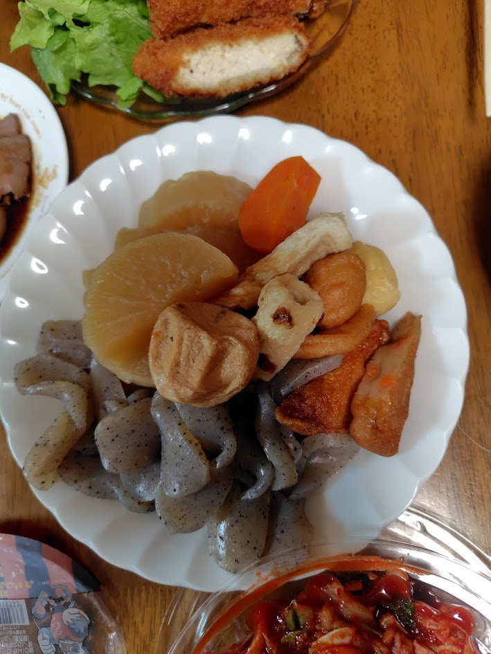 夜はせめてもの抵抗で、キムチとこんにゃくを用意しました。 ……が、隣にはなぜかローストビーフとカツが鎮座しています。 仕上げは、ブラックニッカのグラスに注いだグレープサワーと、ホクホクの焼き芋。