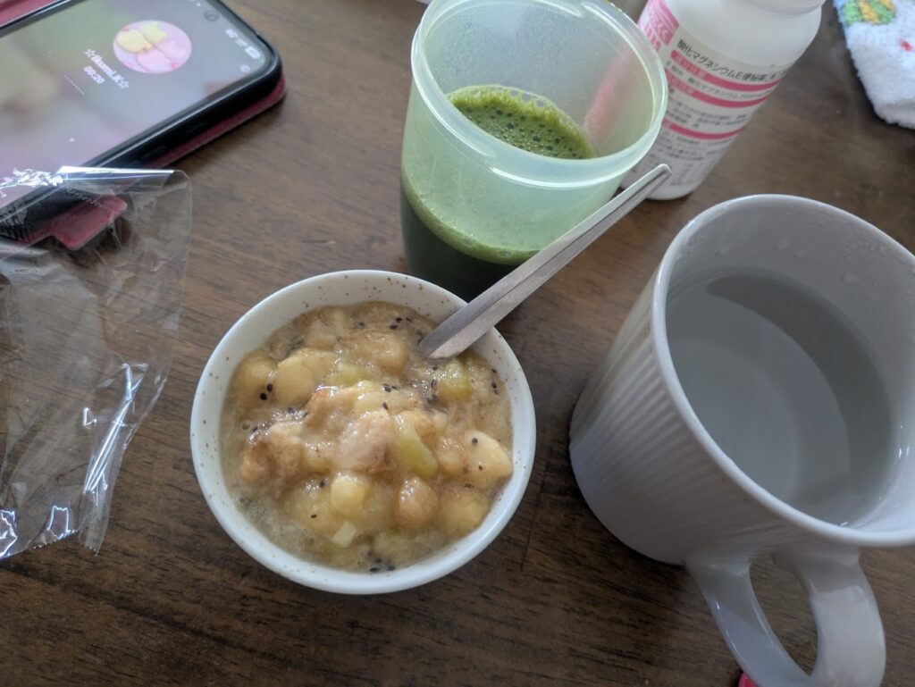 - 朝食: 自家製酵素(バナナ・キウイ・蜂蜜)+青汁酢+湯冷まし
