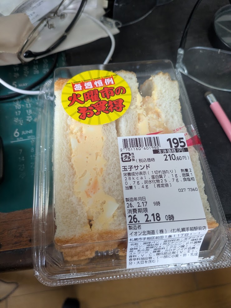 - 「火曜市」のシールが貼られたサンドイッチが、凡歩さんの食欲を象徴しています。