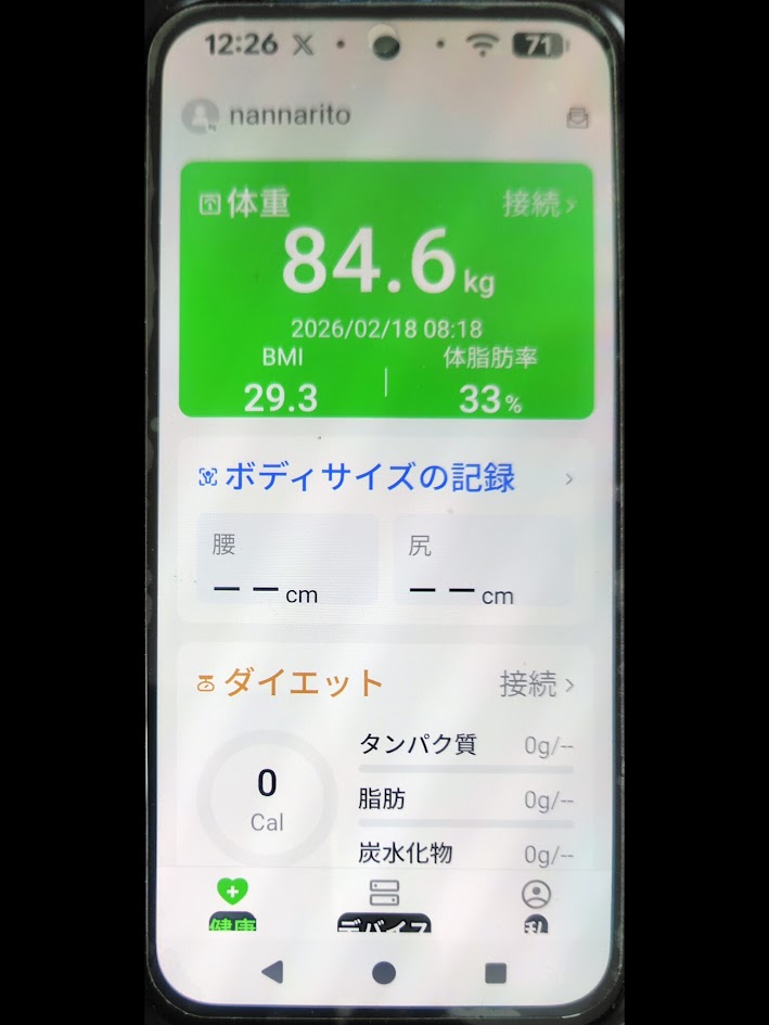 今朝の測定結果は 84.6kg。 前日の84.4kgから着実に0.2kgを積み増しました。Redmi Watchの画面には、もはやお馴染みとなった**「太りすぎ」**の三文字が輝いています。ソースの言葉を借りれば、これこそが「着実にだんだん太ってくるための完璧な布陣」が最終段階に入った証拠と言えるでしょう。