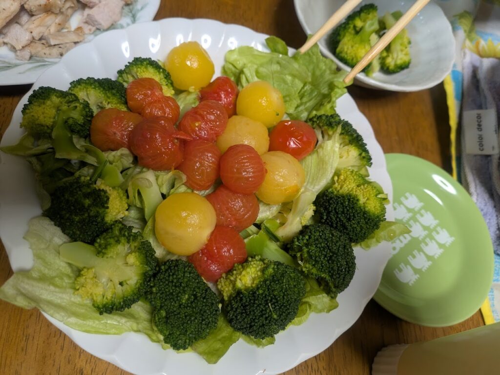 • 夜の温かいご褒美: データには「ご飯にふりかけをかけて」とありますが、写真には鮭めんたいのふりかけご飯に加え、肉、かぼちゃの煮物、卵焼き、山盛りのブロッコリーサラダという豪華な布陣が並んでいます。あばらを痛めた体への「栄養補給」としては、いささか過剰なまでの愛情(欲)が溢れ出しています。