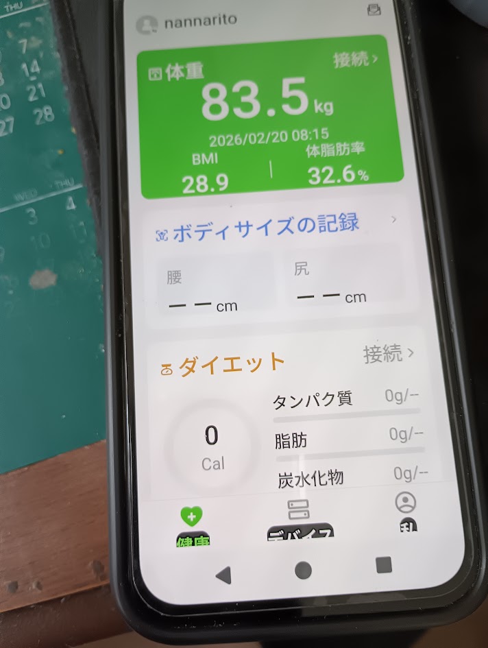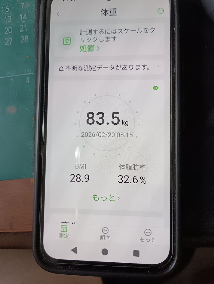 今朝の測定結果は、なんと 83.5kg。 2月18日の 84.6kg、そして17日の 84.4kg という「太りすぎ」判定 から一転、1.1kgもの大幅減量 に成功しました。これまで「着実にだんだん太ってくるための完璧な布陣」 を敷いてきた凡歩さんにとって、これは歴史的な「計算外」の事態です。Redmi Watchの「太りすぎ」判定 も、この急降下には驚いているに違いありません。