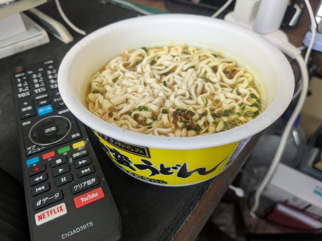 お昼の「カレー」伝統: カスピ海ヨーグルト、コーンスープ、そしてカレーうどんのカップ麺。以前の「カツカレー」 や「贅沢ビーフカレー」 の流れを汲む、安定のカレー系メニューです。