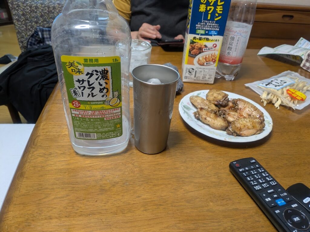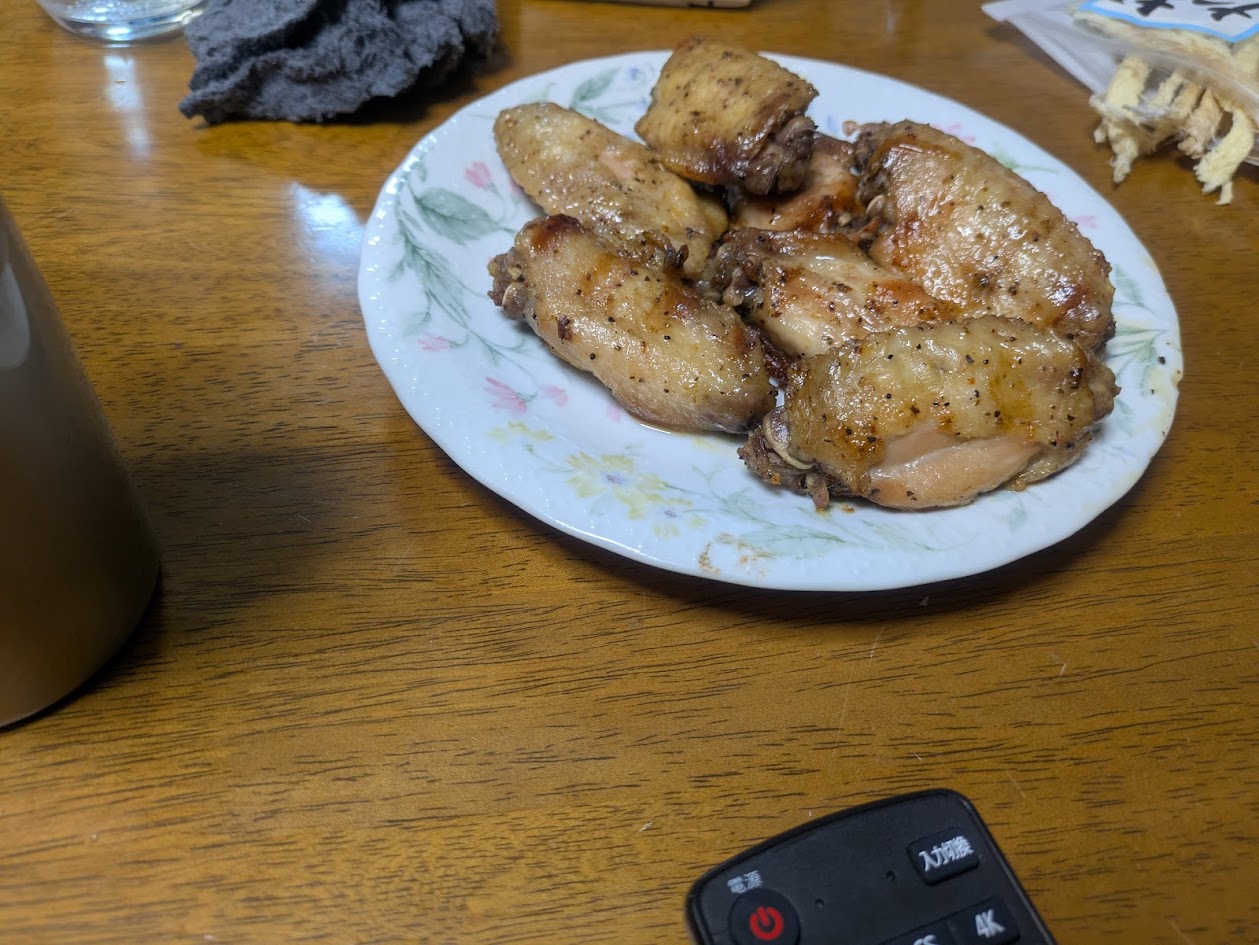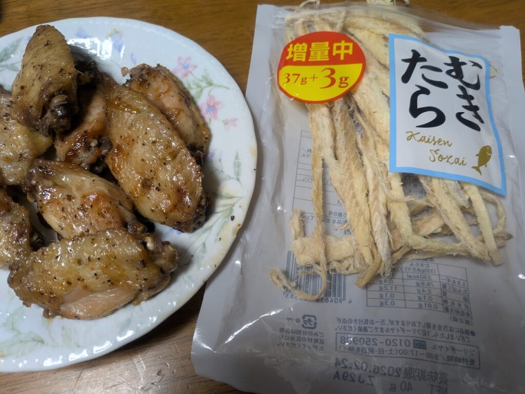• 夜の豪華なつまみ: 晩御飯は焼き鮭、蒸し野菜、卵入りとろろ芋とヘルシー。しかし、その後のアルコールタイムが真骨頂です。手羽元のガーリック焼き、むきたら、ソーセージ、チーズ、そしてすこしのお菓子。 これぞ、ソースで語られた「運動しない・我慢しない」アンチテーゼ の具現化です。