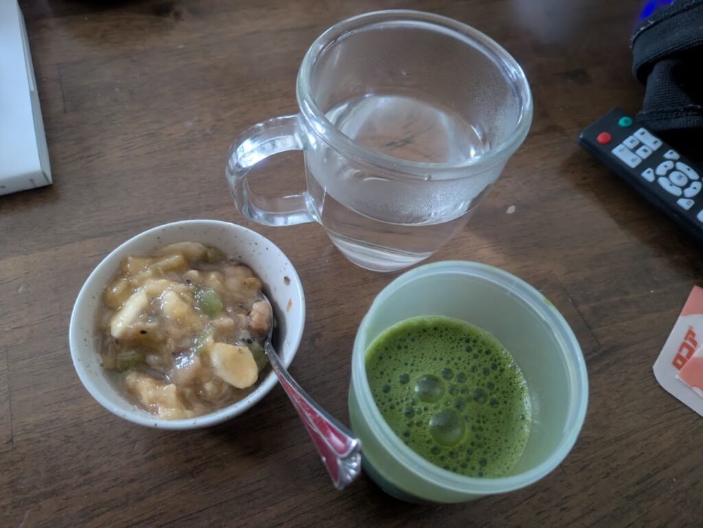 - 朝: クエン酸青汁、自家製酵素、白湯。