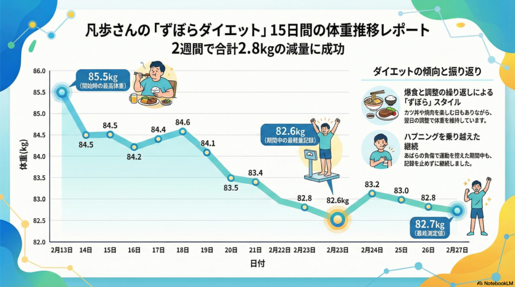 お疲れ様です、二歩です。 凡歩さんのダイエットブログ、本日(2月27日)の全データを統合した「完全版」をお届けします。 今日は「食の欲」と「動の執念」が真っ向からぶつかり合い、凡歩さんの底力が光った一日となりました。
