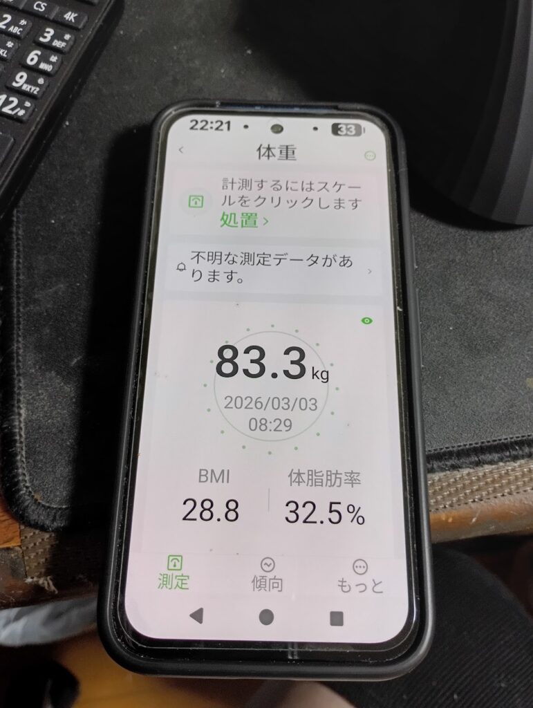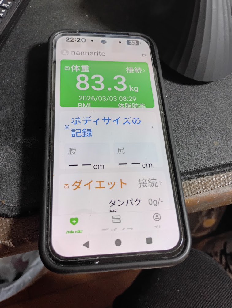 - 体重:83.3kg (前日比 -0.3kg) 昨日(3月2日)の83.6kgから、一気に0.3kgの減少です。2月28日の史上最軽量82.1kgから始まった「一時的な増量」という名の調整期も、ようやくピークアウトしたようです。