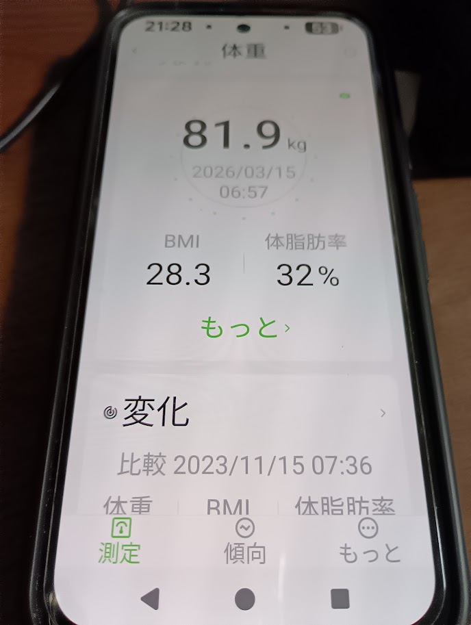 - 体重:81.9kg 今朝の体重は、なんと81.9kg! 前日(82.3kg)から一気に急降下し、夢の81kg台へと舞い戻りました。前夜にカレーとウイスキーを堪能した翌日にこの数値を叩き出すとは、ソースが推奨する「3日スパンの帳尻合わせ」の究極系です。