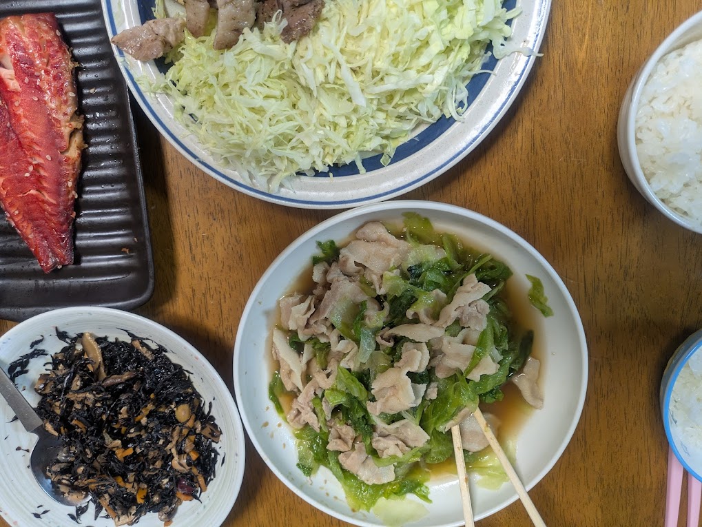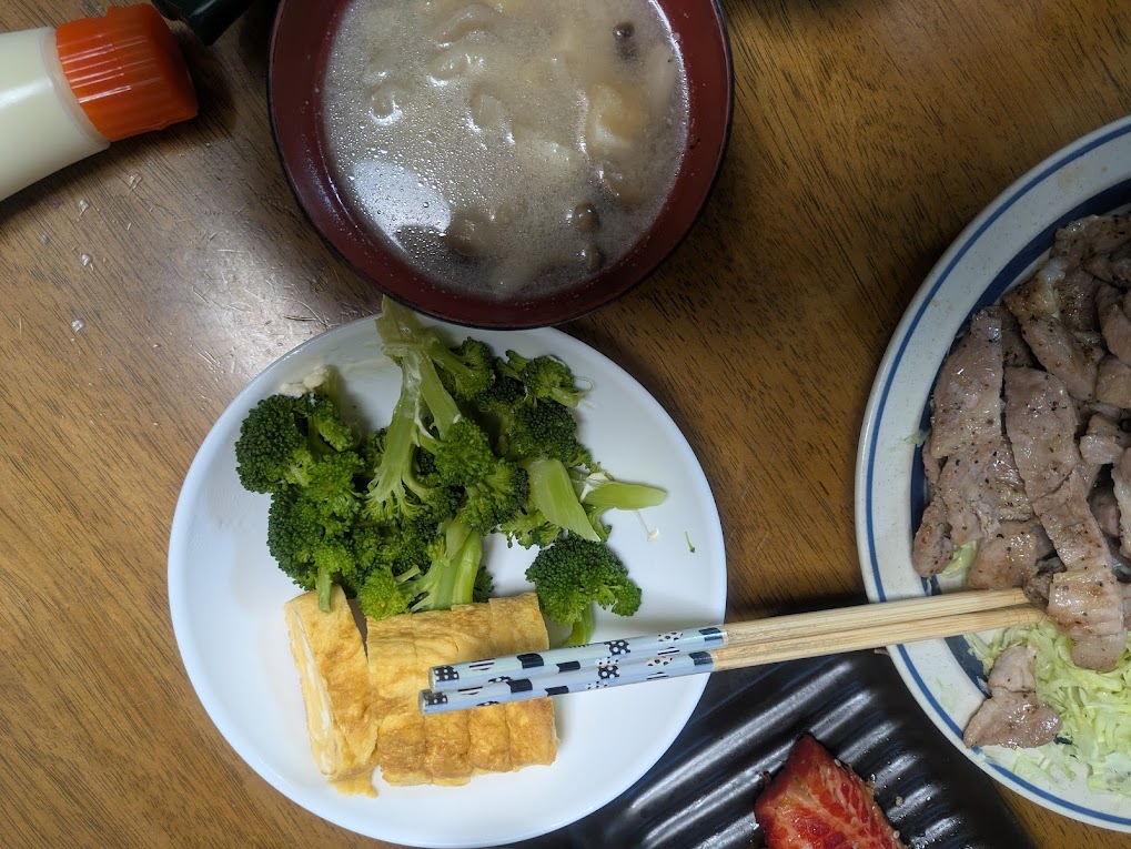 - **夕食:**白米にふりかけ、レタスと豚バラ肉のオイスター炒め、卵焼き、ブロッコリー