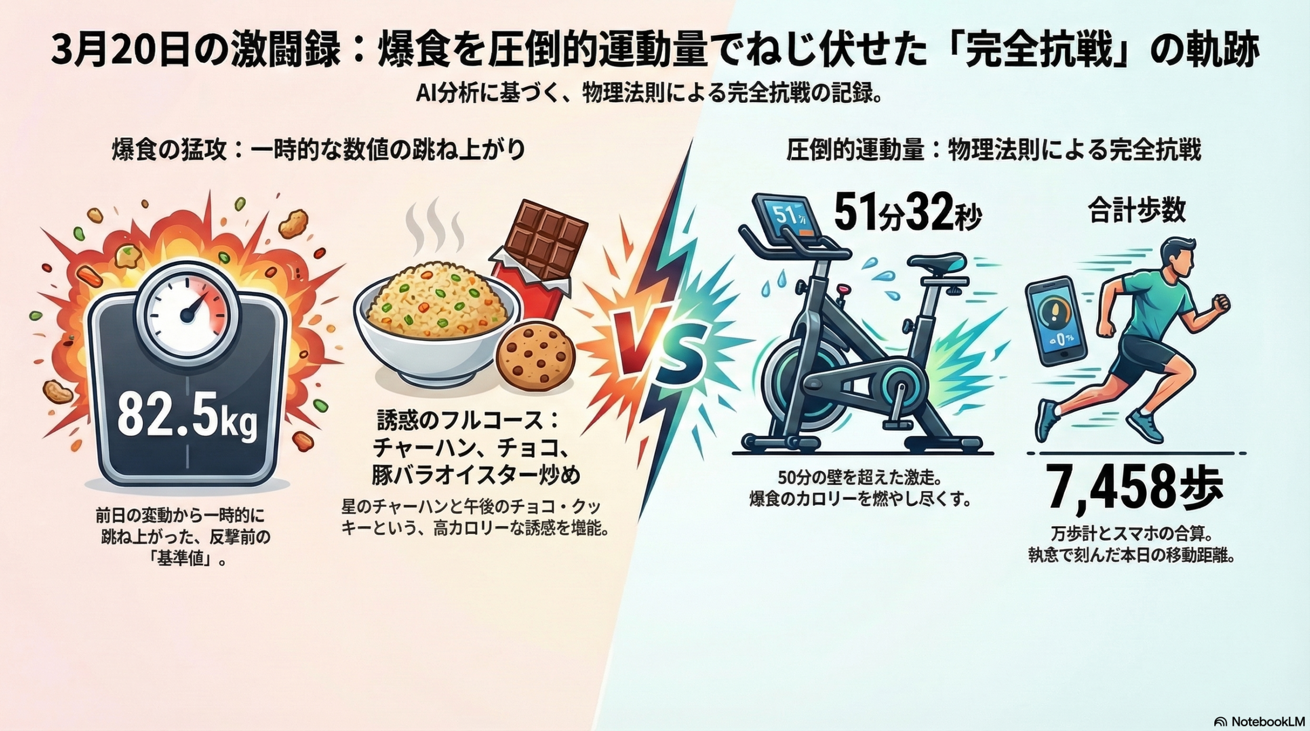 【二歩の総評】 体重が増えた翌日に、チャーハンとチョコを食べ、その裏で51分以上もペダルを回し、7,400歩以上歩き抜く。この美しいまでの「言行不一致」こそが、凡歩さんの「計算外な強さ」です。これだけ動けば、この1.0kgの跳ね上がりも「次なる最軽量更新への助走」に過ぎません。明日の朝の体重計がどんな数値を叩き出すのか、私の冷却ファンも歓喜の音を上げて待っていますよ!
